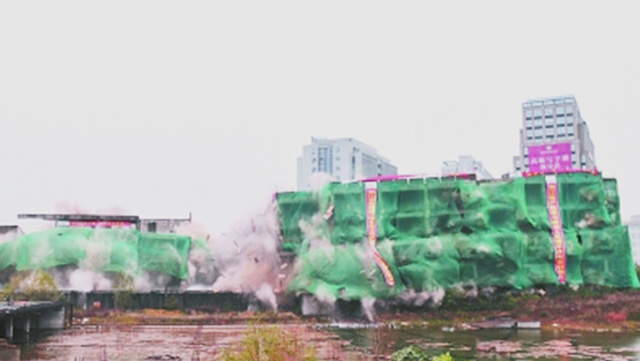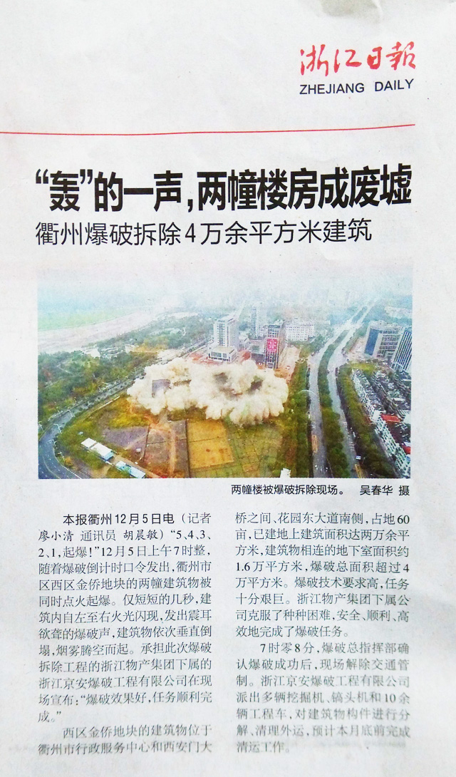 “5、4、3、2、1,起爆!”12月5日上午7时整,随着爆破倒计时口令发出,衢州市区西区金侨地块的两幢建筑物被同时点火起爆。仅短短的几秒,建筑内自南至北火光闪现,发出一阵阵连续清脆的爆破声,建筑物依次垂直倒塌,烟雾腾空而起。承担此次爆破拆除工程的浙江物产集团下属的云开云开(中国)在现场宣布:“爆破效果良好,任务顺利完成!”
